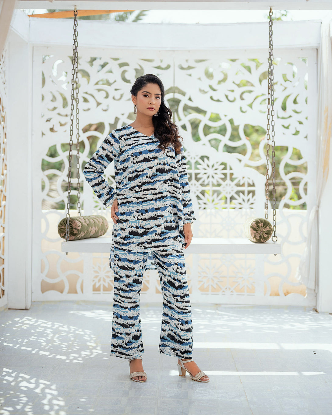Fabric: Soft, breathable non-lawn material. Digitally Printed Abstract Pattern. Relaxed & Flattering Fit. Ideal for Daywear, Travel, or Lounge Style. Easy to Pair with Flats or Heels.
